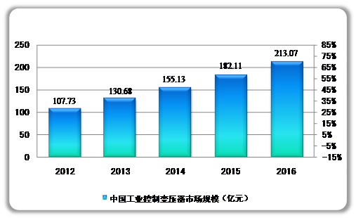 随着下游工业控制行业需求的增长,未来工业控制用变压器行业市场规模也将保持快速稳定的增长,2016年中国工业控制用变压器行业市场规模将达到213.07亿元。
