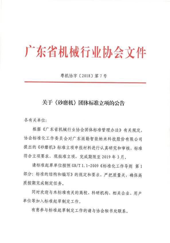 关于《砂磨机》团体标准立项的公告